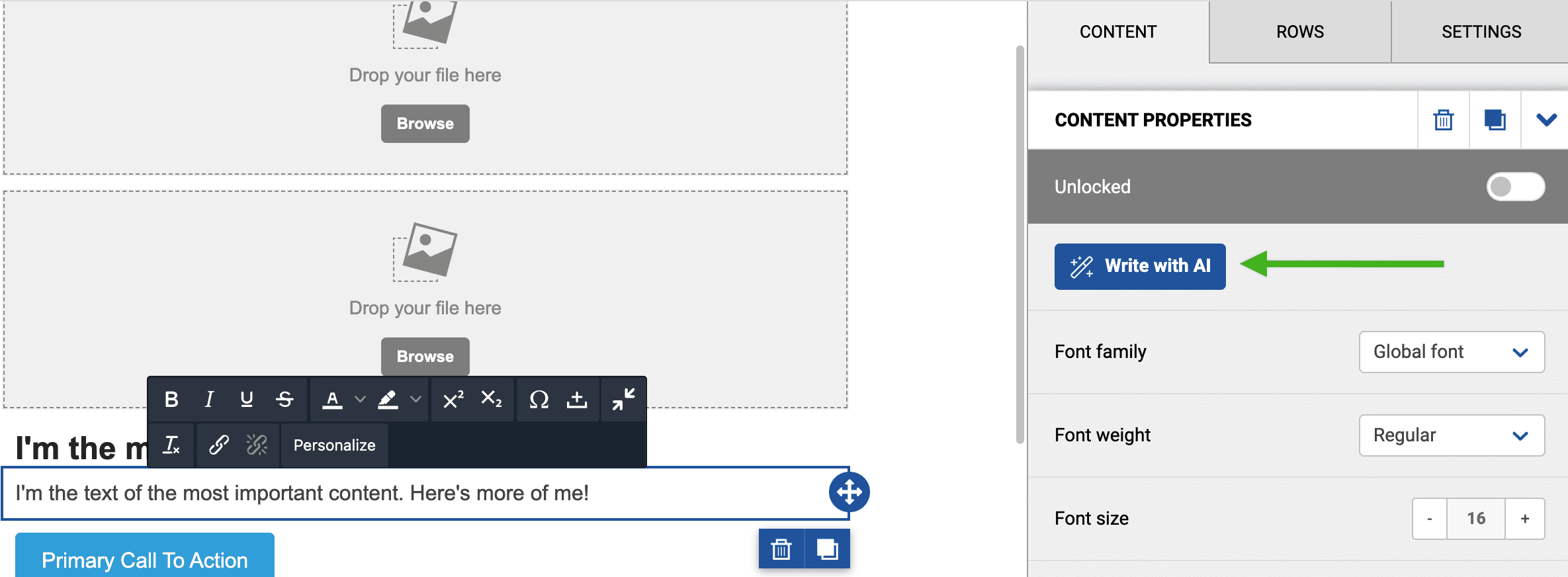 To access the AI Assistant, simply create a new campaign; if you have an existing draft of a drag and drop campaign, you can also start there. Once you’ve opened a campaign, click inside a title, paragraph, list, or button block and then click on the Write with AI button to get started.