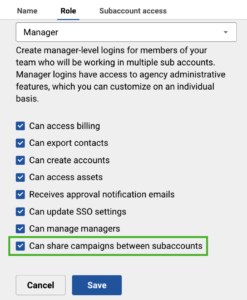- Check the Can share campaigns between subaccounts box.