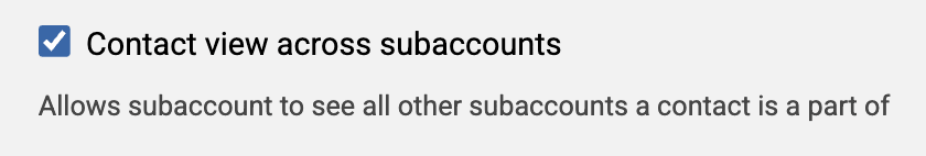 The Contact View Across Subaccounts feature is enabled at the subaccount level and must be turned on by the account Parent or a Manager. To enable the feature for a particular subaccount: