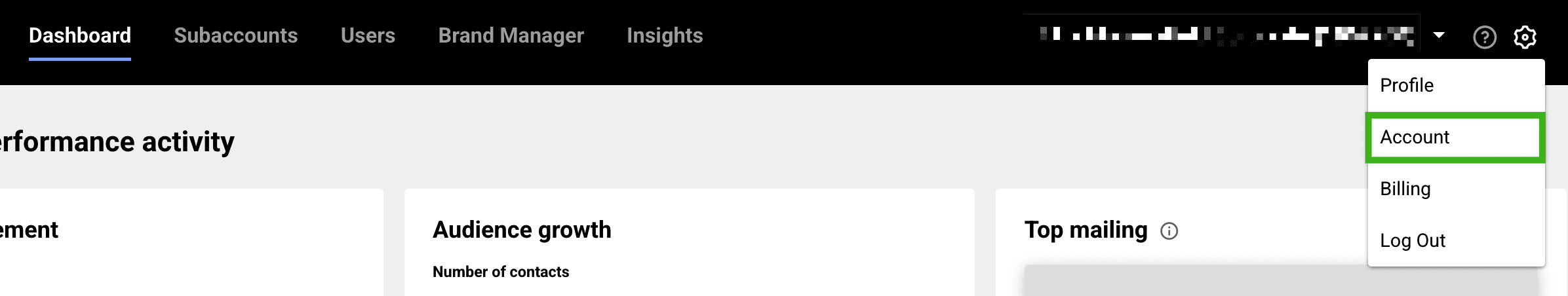 - Select Account from the dropdown menu. If you are working in a subaccount, select the Account option under “Parent account settings”.