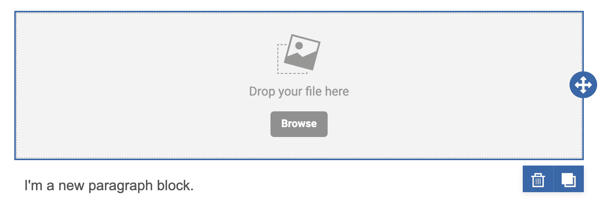 To delete a content block, click on the trashcan icon in the blue toolbar. To duplicate a content block, click on the icon with the two squares on it, next to the trashcan icon.