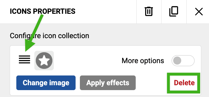 To re-order your icons, click on the set of four lines to the left of the icon in the Icons Properties panel and drag the icon up or down.